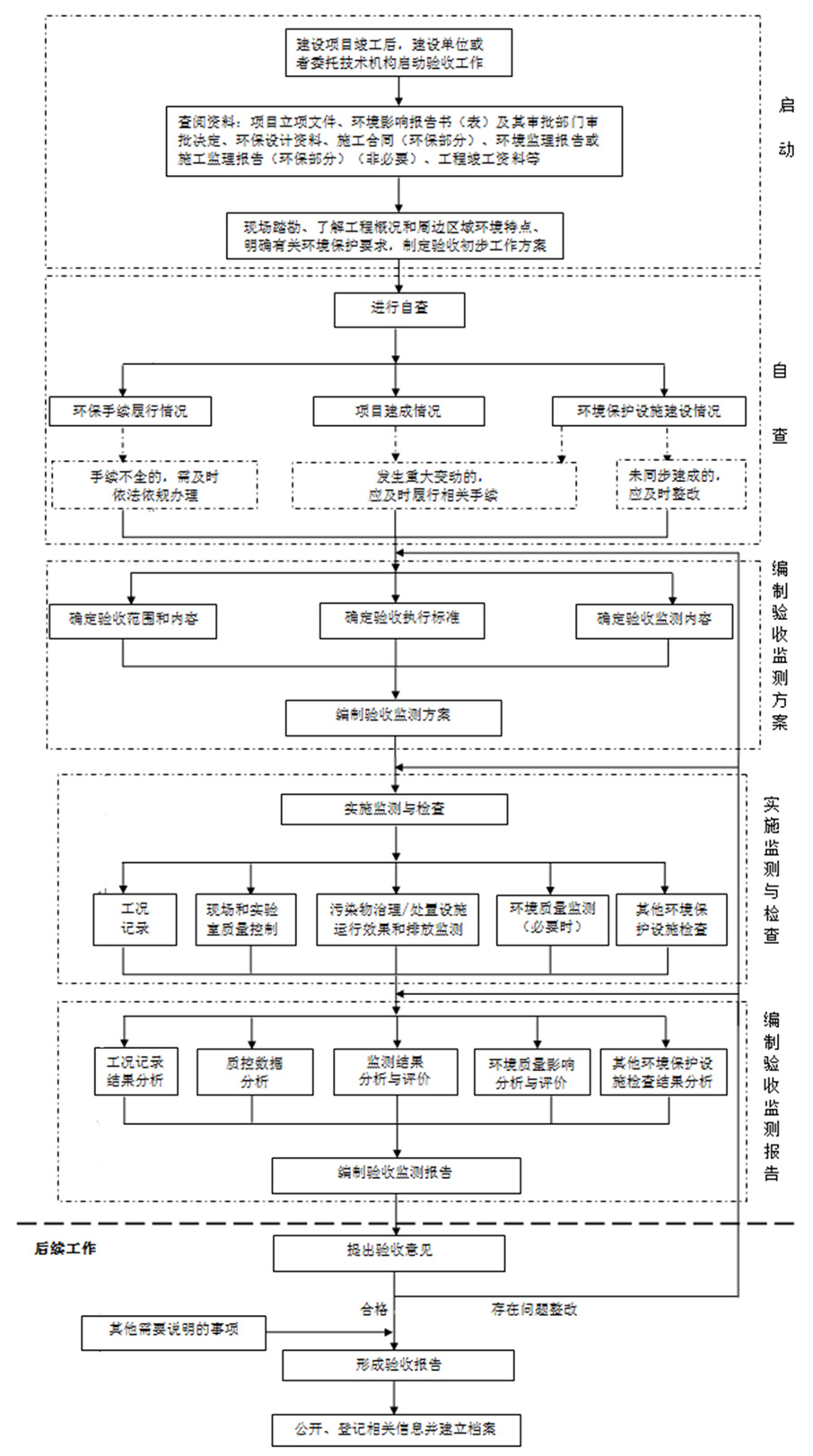 驗收工作主要包括驗收監測工作和后續工作,其中驗收監測工作可分為啟動、自查、編制驗收監測方案、實施監測與檢查、編制驗收監測報告五個階段。具體工作程序見圖1。