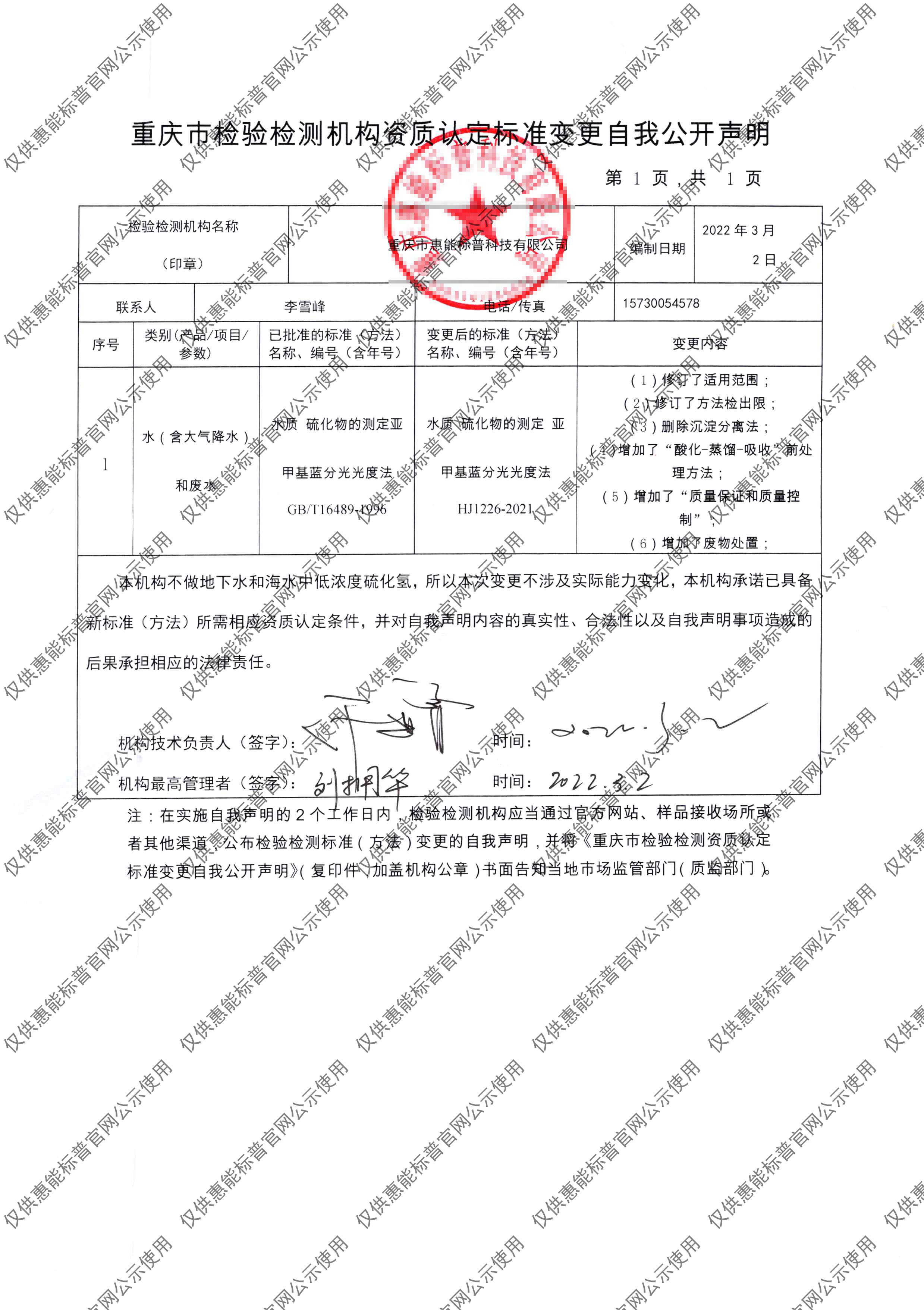 重慶市檢驗檢測機構資質認定標準變更自我公開聲明