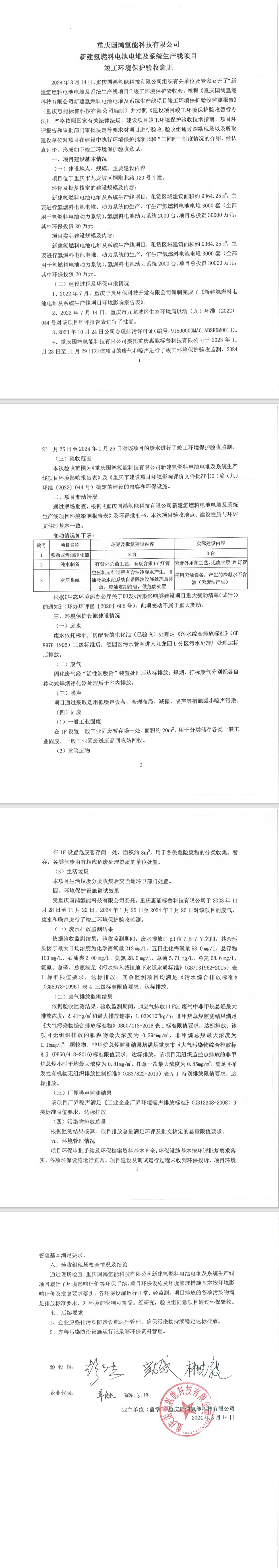 根據(jù)《建設(shè)項(xiàng)目竣工環(huán)境保護(hù)驗(yàn)收暫行辦法》,現(xiàn)將重慶國(guó)鴻氫能科技有限公司新建氫燃料電池電堆及系統(tǒng)生產(chǎn)線項(xiàng)目竣工環(huán)境保護(hù)驗(yàn)收?qǐng)?bào)告公示如下: