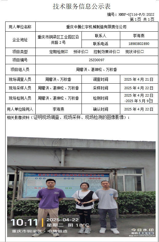 重慶中騰仁宇機械制造有限責任公司定期檢測項目公示