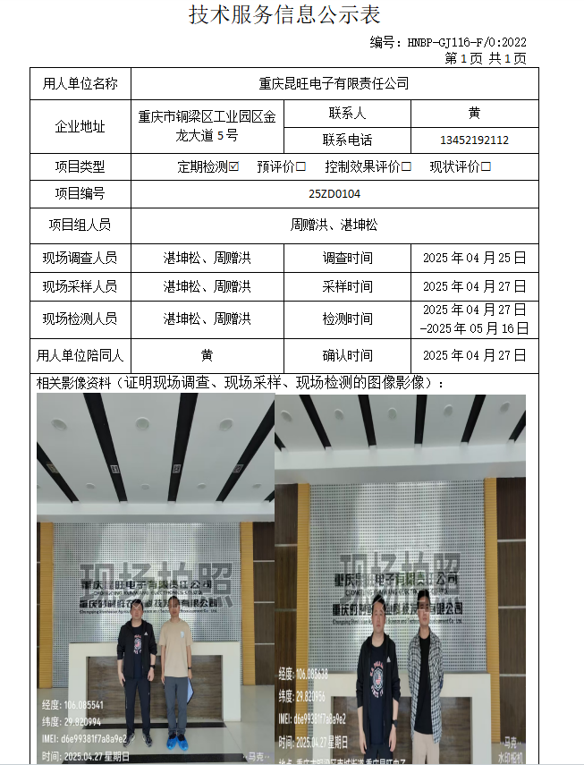 重慶昆旺電子有限責任公司定期檢測項目公示