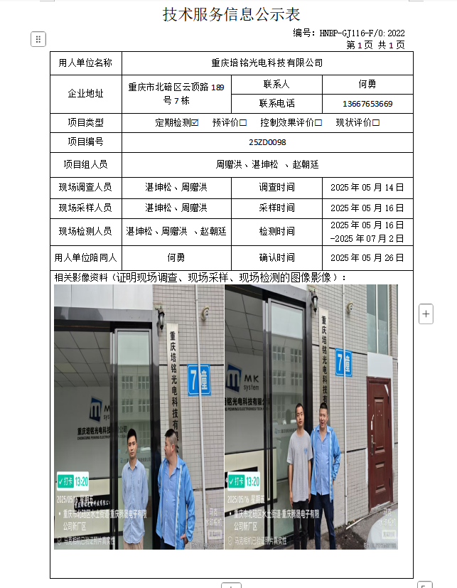 重慶培銘光電科技有限公司定期檢測項目公示