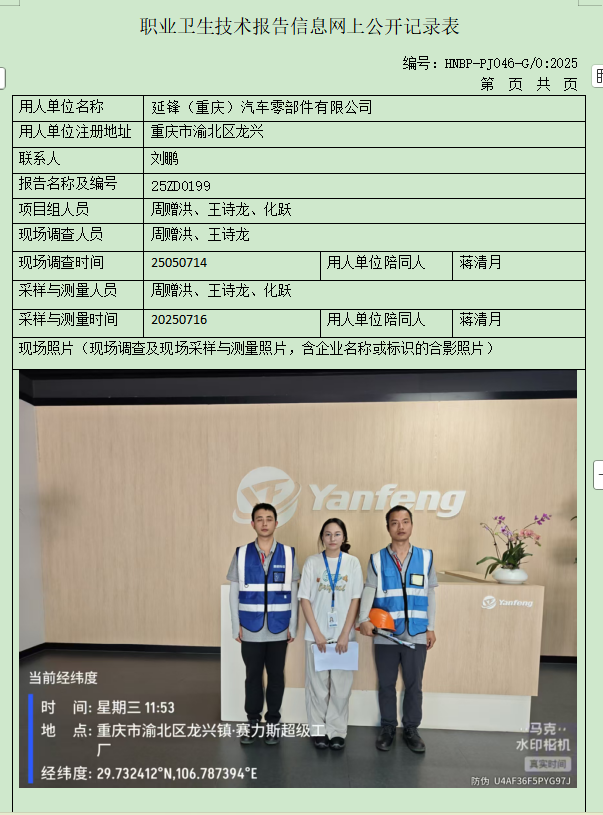 延鋒(重慶)汽車零部件有限公司定期檢測項目公示